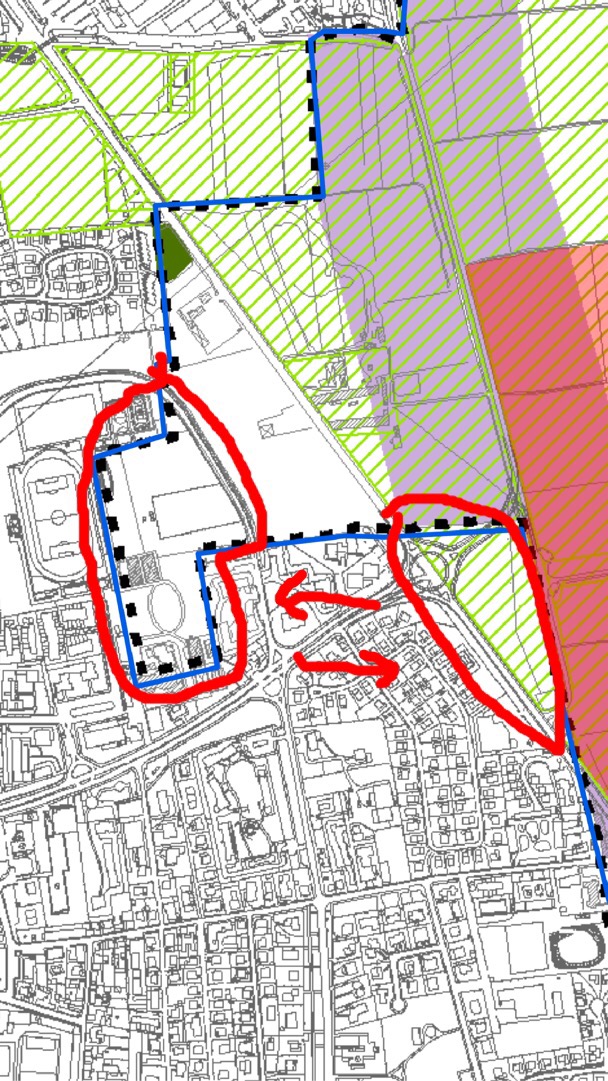 2: (linea tratteggiata viola) nuova “strada locale di progetto”, per spostare il traffico da via Kennedy