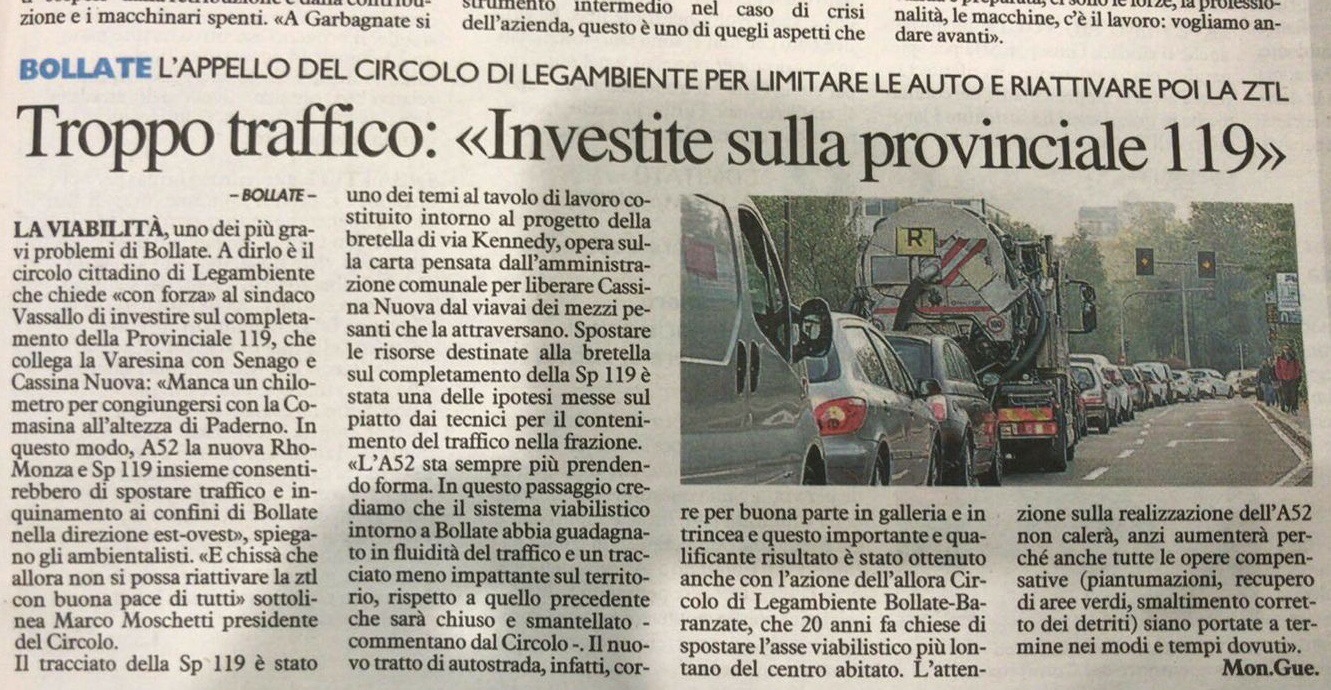 Condividiamo l’articolo pubblicato su ” il Giorno” è il comunicato stampa del circolo bollatese di Legambiente, che chiede il completamento della strada provinciale n119