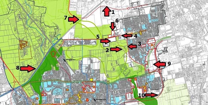 6: (perimetro in linea rossa) la nuova area produttiva individuata dal P.G.T. (Il piano di governo del territorio di Bollate, e che comprende il vecchio inceneritore di Cassina Nuova, abbandonato a sé stesso da più di 20 anni
